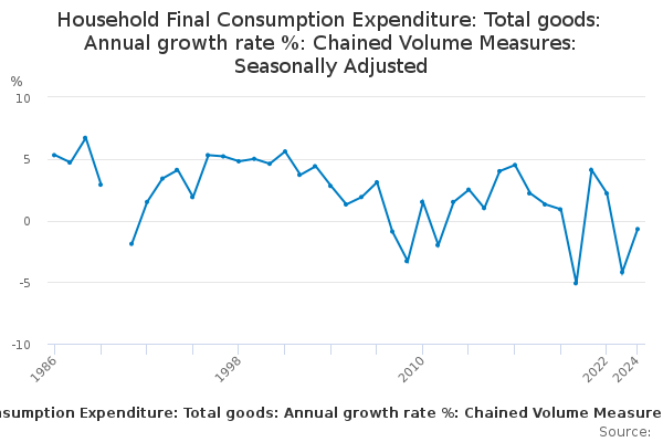 Download this time seriesHousehold Final Consumption Expenditure: Total goods: Annual growth rate %: Chained Volume Measures: Seasonally Adjusted
