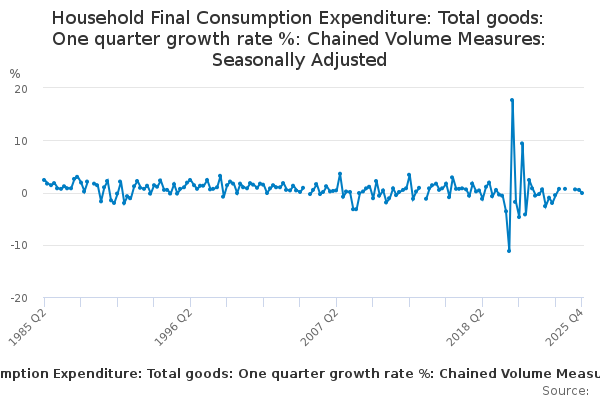Download this time seriesHousehold Final Consumption Expenditure: Total goods: One quarter growth rate %: Chained Volume Measures: Seasonally Adjusted