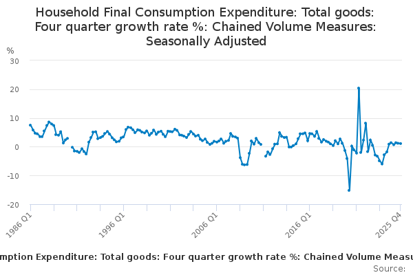 Download this time seriesHousehold Final Consumption Expenditure: Total goods: Four quarter growth rate %: Chained Volume Measures: Seasonally Adjusted