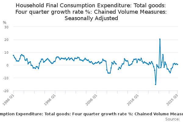 Download this time seriesHousehold Final Consumption Expenditure: Total goods: Four quarter growth rate %: Chained Volume Measures: Seasonally Adjusted
