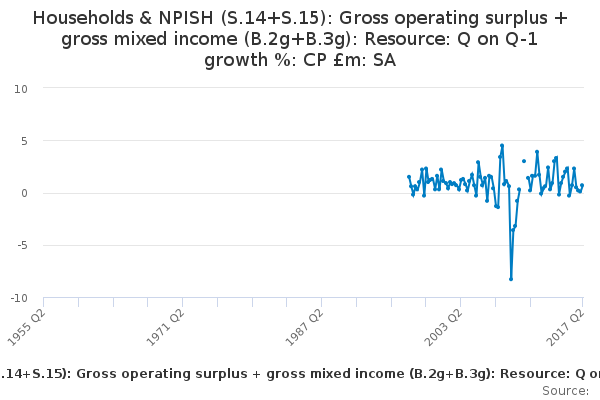 Download this time seriesHouseholds & NPISH (S.14+S.15): Gross operating surplus + gross mixed income (B.2g+B.3g): Resource: Q on Q-1 growth %: CP £m: SA