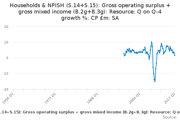 Download this time seriesHouseholds & NPISH (S.14+S.15): Gross operating surplus + gross mixed income (B.2g+B.3g): Resource: Q on Q-4 growth %: CP £m: SA