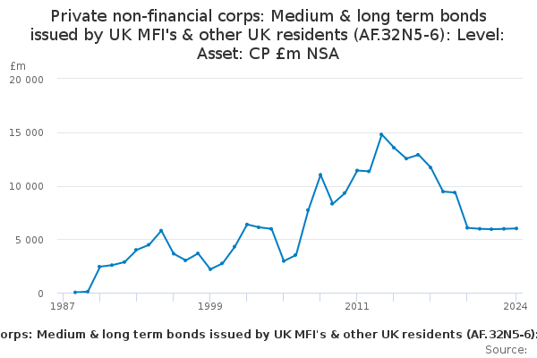 Download this time seriesPrivate non-financial corps: Medium & long term bonds issued by UK MFI's & other UK residents (AF.32N5-6): Level: Asset: CP £m NSA