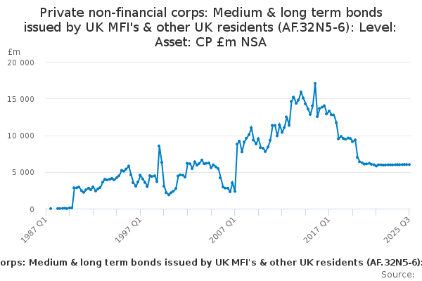 Download this time seriesPrivate non-financial corps: Medium & long term bonds issued by UK MFI's & other UK residents (AF.32N5-6): Level: Asset: CP £m NSA
