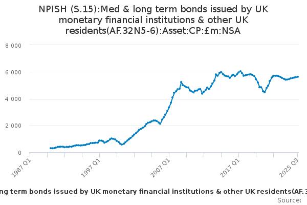 Download this time seriesNPISH (S.15):Med & long term bonds issued by UK monetary financial institutions & other UK residents(AF.32N5-6):Asset:CP:£m:NSA