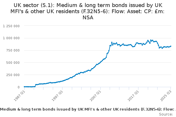 Download this time seriesUK sector (S.1): Medium & long term bonds issued by UK MFI's & other UK residents (F.32N5-6): Flow: Asset: CP: £m: NSA