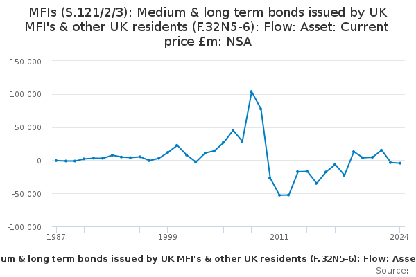 Download this time seriesMFIs (S.121/2/3): Medium & long term bonds issued by UK MFI's & other UK residents (F.32N5-6): Flow: Asset: Current price £m: NSA