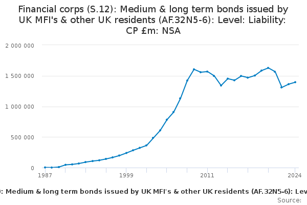 Download this time seriesFinancial corps (S.12): Medium & long term bonds issued by UK MFI's & other UK residents (AF.32N5-6): Level: Liability: CP £m: NSA