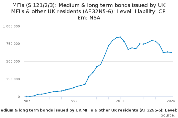 Download this time seriesMFIs (S.121/2/3): Medium & long term bonds issued by UK MFI's & other UK residents (AF.32N5-6): Level: Liability: CP £m: NSA