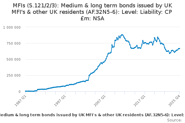 Download this time seriesMFIs (S.121/2/3): Medium & long term bonds issued by UK MFI's & other UK residents (AF.32N5-6): Level: Liability: CP £m: NSA