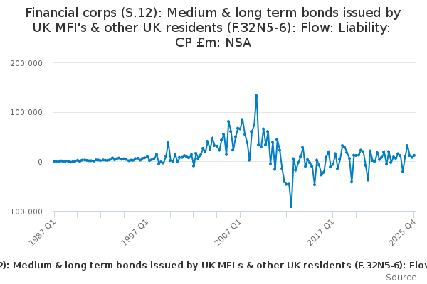 Download this time seriesFinancial corps (S.12): Medium & long term bonds issued by UK MFI's & other UK residents (F.32N5-6): Flow: Liability: CP £m: NSA