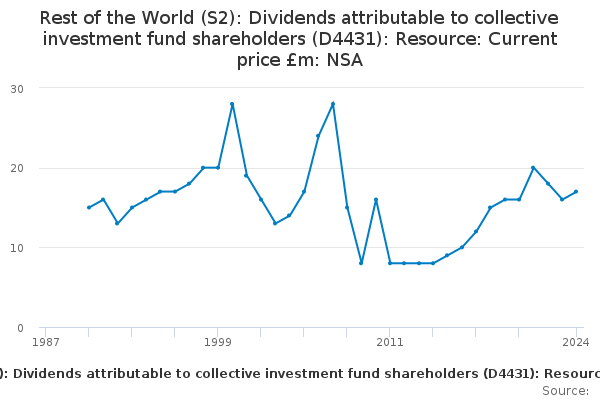 Download this time seriesRest of the World (S2): Dividends attributable to collective investment fund shareholders (D4431): Resource: Current price £m: NSA