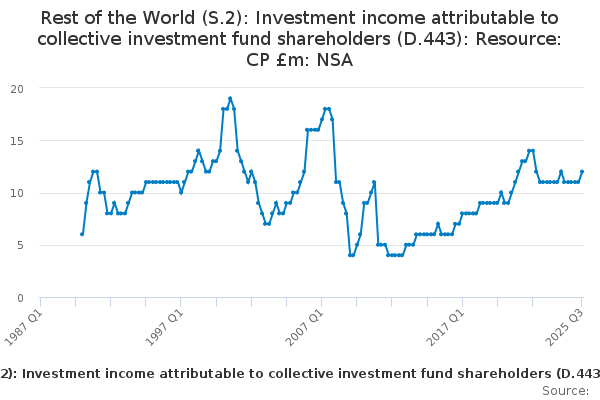 Download this time seriesRest of the World (S.2): Investment income attributable to collective investment fund shareholders (D.443): Resource: CP £m: NSA