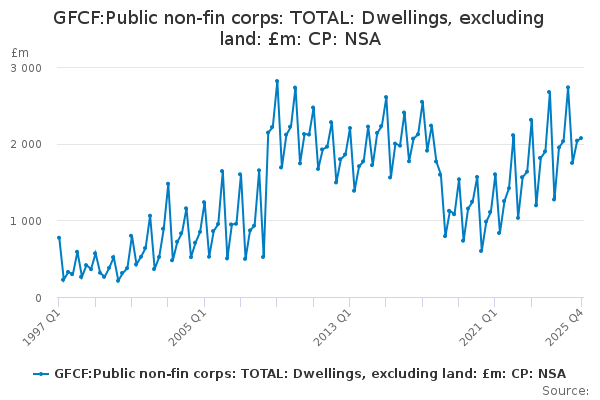 Download this time seriesGFCF:Public non-fin corps: TOTAL: Dwellings, excluding land: £m: CP: NSA