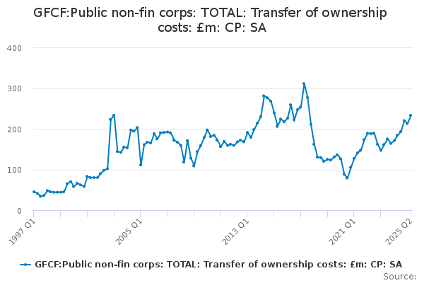 Download this time seriesGFCF:Public non-fin corps: TOTAL: Transfer of ownership costs: £m: CP: SA