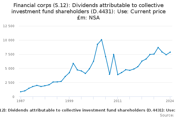 Download this time seriesFinancial corps (S.12): Dividends attributable to collective investment fund shareholders (D.4431): Use: Current price £m: NSA