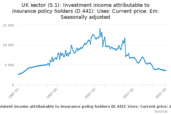 Download this time seriesUK sector (S.1): Investment income attributable to insurance policy holders (D.441): Uses: Current price: £m: Seasonally adjusted
