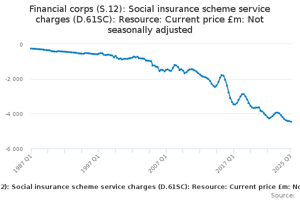 Download this time seriesFinancial corps (S.12): Social insurance scheme service charges (D.61SC): Resource: Current price £m: Not seasonally adjusted