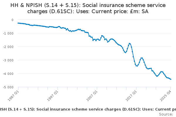 Download this time seriesHH & NPISH (S.14 + S.15): Social insurance scheme service charges (D.61SC): Uses: Current price: £m: SA
