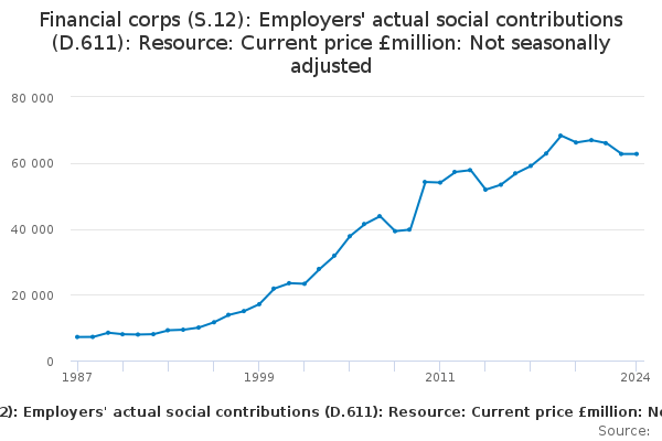 Download this time seriesFinancial corps (S.12): Employers' actual social contributions (D.611): Resource: Current price £million: Not seasonally adjusted
