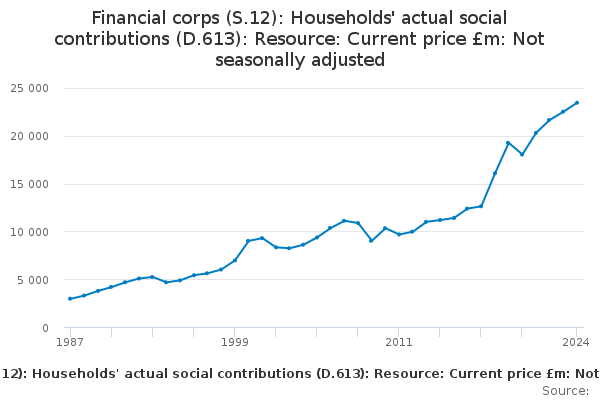 Download this time seriesFinancial corps (S.12): Households' actual social contributions (D.613): Resource: Current price £m: Not seasonally adjusted