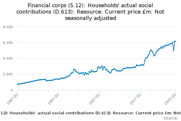 Download this time seriesFinancial corps (S.12): Households' actual social contributions (D.613): Resource: Current price £m: Not seasonally adjusted