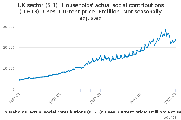 Download this time seriesUK sector (S.1): Households' actual social contributions (D.613): Uses: Current price: £million: Not seasonally adjusted