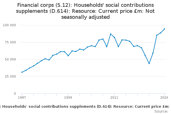 Download this time seriesFinancial corps (S.12): Households' social contributions supplements (D.614): Resource: Current price £m: Not seasonally adjusted