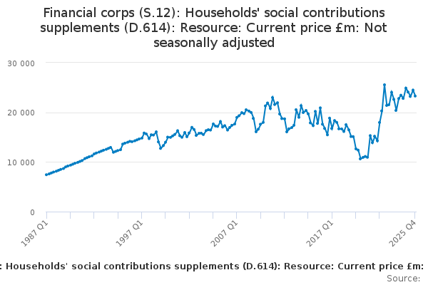 Download this time seriesFinancial corps (S.12): Households' social contributions supplements (D.614): Resource: Current price £m: Not seasonally adjusted