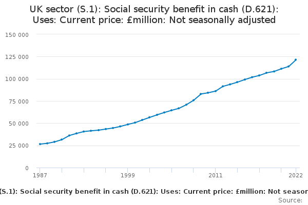 Download this time seriesUK sector (S.1): Social security benefit in cash (D.621): Uses: Current price: £million: Not seasonally adjusted