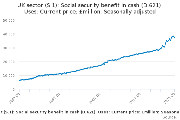 Download this time seriesUK sector (S.1): Social security benefit in cash (D.621): Uses: Current price: £million: Seasonally adjusted