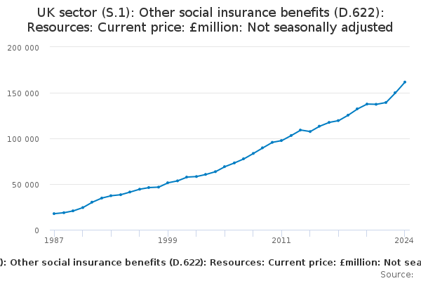 Download this time seriesUK sector (S.1): Other social insurance benefits (D.622): Resources: Current price: £million: Not seasonally adjusted