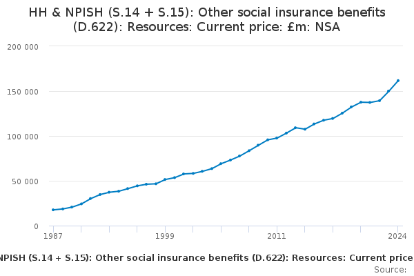 Download this time seriesHH & NPISH (S.14 + S.15): Other social insurance benefits (D.622): Resources: Current price: £m: NSA