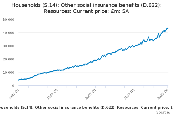 Download this time seriesHouseholds (S.14): Other social insurance benefits (D.622): Resources: Current price: £m: SA