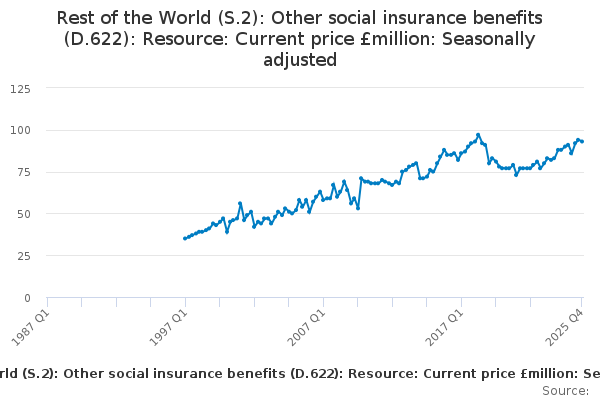 Download this time seriesRest of the World (S.2): Other social insurance benefits (D.622): Resource: Current price £million: Seasonally adjusted