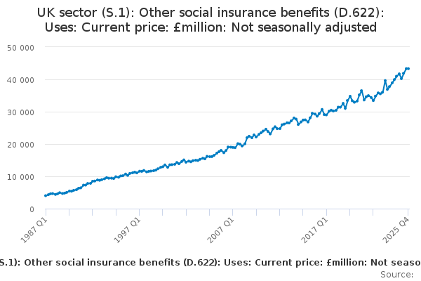 Download this time seriesUK sector (S.1): Other social insurance benefits (D.622): Uses: Current price: £million: Not seasonally adjusted