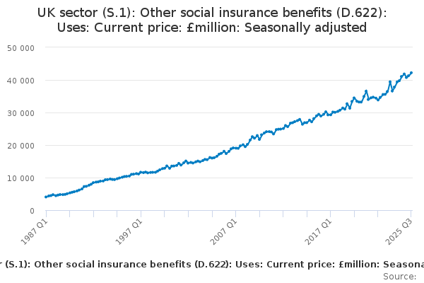 Download this time seriesUK sector (S.1): Other social insurance benefits (D.622): Uses: Current price: £million: Seasonally adjusted