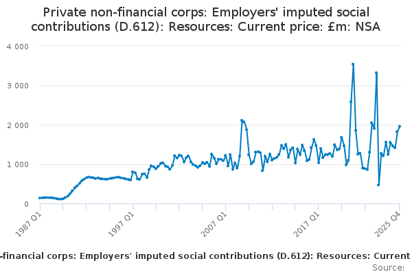Download this time seriesPrivate non-financial corps: Employers' imputed social contributions (D.612): Resources: Current price: £m: NSA