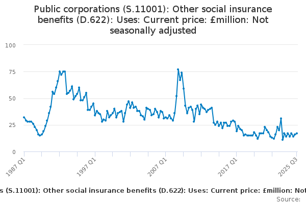 Download this time seriesPublic corporations (S.11001): Other social insurance benefits (D.622): Uses: Current price: £million: Not seasonally adjusted