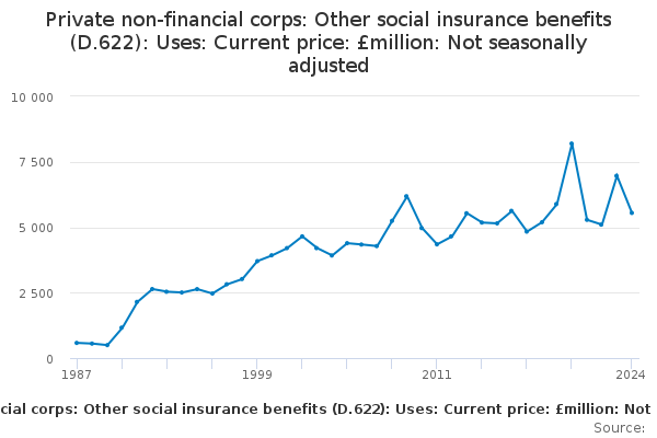 Download this time seriesPrivate non-financial corps: Other social insurance benefits (D.622): Uses: Current price: £million: Not seasonally adjusted