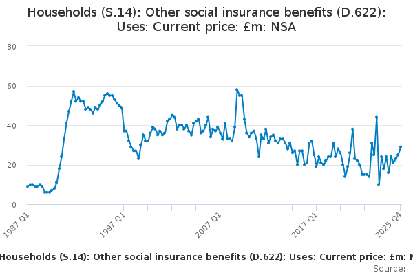 Download this time seriesHouseholds (S.14): Other social insurance benefits (D.622): Uses: Current price: £m: NSA