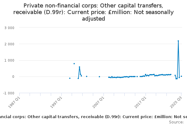Download this time seriesPrivate non-financial corps: Other capital transfers, receivable (D.99r): Current price: £million: Not seasonally adjusted
