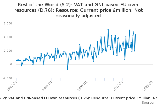Download this time seriesRest of the World (S.2): VAT and GNI-based EU own resources (D.76): Resource: Current price £million: Not seasonally adjusted