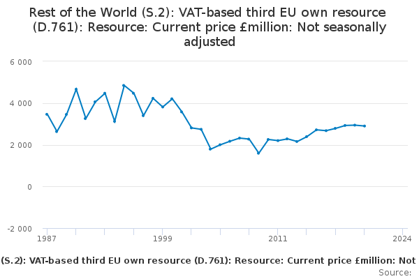 Download this time seriesRest of the World (S.2): VAT-based third EU own resource (D.761): Resource: Current price £million: Not seasonally adjusted