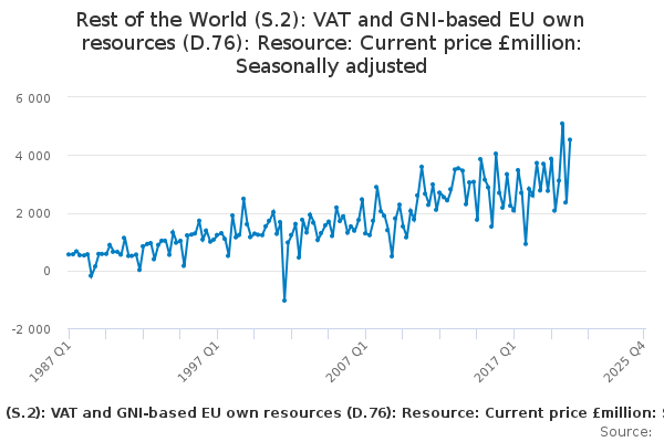 Download this time seriesRest of the World (S.2): VAT and GNI-based EU own resources (D.76): Resource: Current price £million: Seasonally adjusted