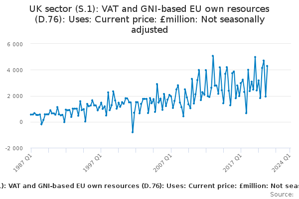 Download this time seriesUK sector (S.1): VAT and GNI-based EU own resources (D.76): Uses: Current price: £million: Not seasonally adjusted