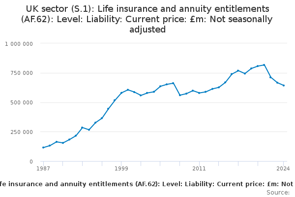 Download this time seriesUK sector (S.1): Life insurance and annuity entitlements (AF.62): Level: Liability: Current price: £m: Not seasonally adjusted