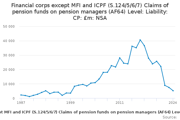 Download this time seriesFinancial corps except MFI and ICPF (S.124/5/6/7) Claims of pension funds on pension managers (AF64) Level: Liability: CP: £m: NSA