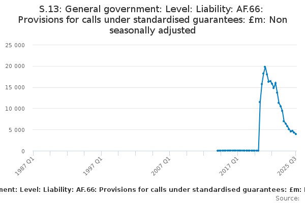 Download this time seriesS.13: General government: Level: Liability: AF.66: Provisions for calls under standardised guarantees: £m: Non seasonally adjusted
