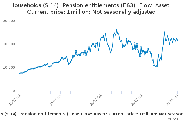 Download this time seriesHouseholds (S.14): Pension entitlements (F.63): Flow: Asset: Current price: £million: Not seasonally adjusted